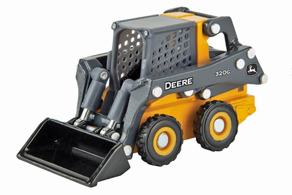 - Diecast metal scale model John Deere 320G skid steer loader, with some plastic parts