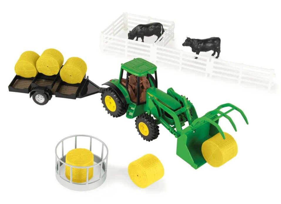 This 20-piece set features a die-cast and plastic cab tractor with grapple bucket. The trailer has removable bale holders to keep them in place and doubles as a flatbed.