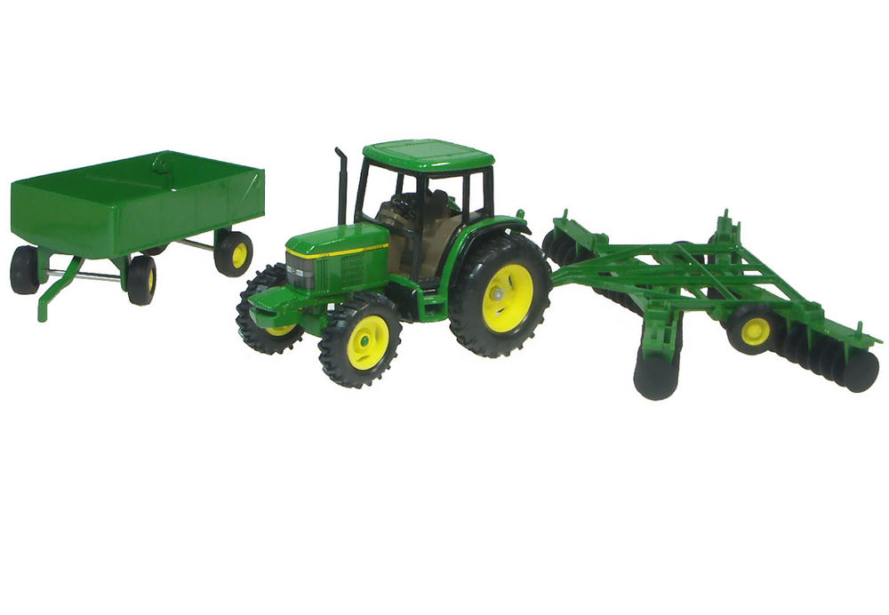 - Diecast metal scale model tractor and implement set by Ertl, with some plastic parts